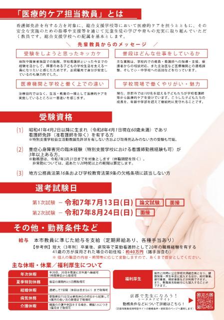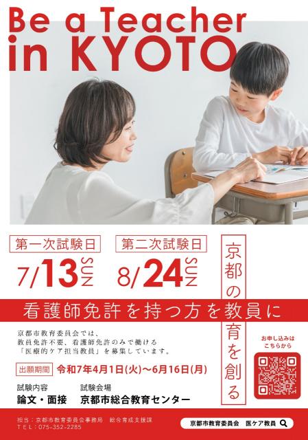 令和8年度(令和7年度実施)京都市立総合支援学校 医療的ケア(自立活動)担当教員採用選考試験結果概要については、以下のPDFをご確認ください。